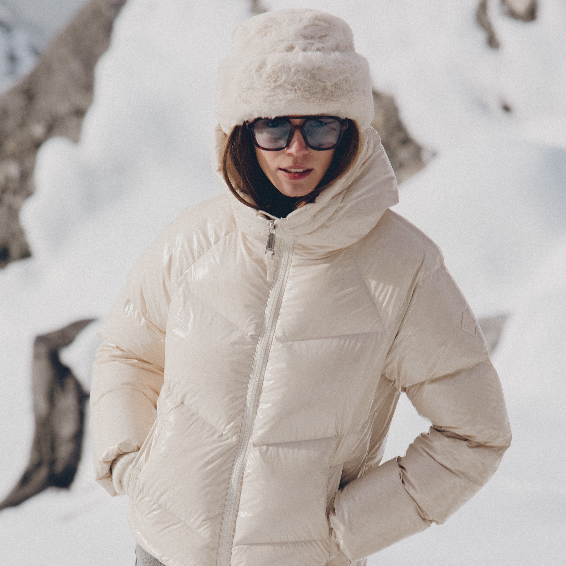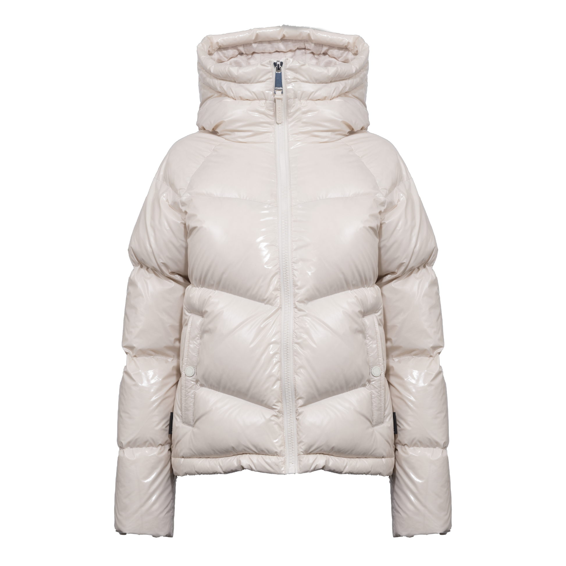 Chic warmth for winter days. This glossy puffer jacket combines luxurious feather filling with a sleek, modern design. Its oversized hood and quilted finish deliver ultimate comfort and style—ideal for staying cozy while turning heads.